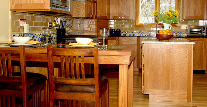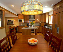 It took only a few minutes for me to realize that the layout of this kitchen needed to be flip-flopped. The dining room that extended off the kitchen was a very dark, large space and never used. The kitchen area was small with very little usable space. They had requested the kitchen to be redesigned in the Arts and Crafts style. My design repositioned the larger appliances to be placed in the former dining area, and the dining table to be moved into what had been the kitchen space.
