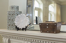 I took my design inspiration from the graceful line of the arched windows. I introduced soft curves on the silhouette of the main furniture pieces. I selected a calm blue-gray, burnt gold and cream color palette to compliment the Indian artwork highlighted above the sofa. Different textures were selected for the upholstered pieces to create interest within the calm color palette. The fabrics selected are timeless and sophisticated yet offer a “user friendly” quality. The pedestal table with four chairs provides additional seating as well as a place to do homework.