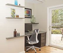 One closet became a functional workspace, wired for computer/phone and additional lighting. The desktop extended beyond the edge of the existing wall and was designed with shelving above. This detail eliminated the feeling of sitting in a closet. The north wall became a very long wall when the two rooms became one room. The homeowner asked for windows to be added to the large blank wall. Unfortunately there was not a desirable view on the other side of the wall. So instead I designed two long rectangular windows to be installed at the top third of the wall, allowing us to see pleasant blue skies while hiding the unappealing view of the air conditioner and the neighbor’s garage. The addition of the windows positioned at the top third of the wall allows your eye to focus beyond the wall to the outside and not on the header that separated the original two rooms.