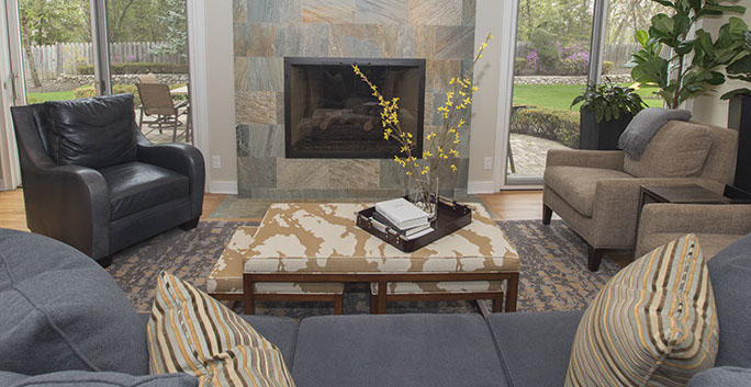 This project was a re-awaking for the space. This large L-shaped room had a lot of beautiful western light exposure, but was unfortunately trapped in the past with much of the décor: the painted panel wall treatment, an overpowering rock-faced fireplace, heavy bookshelves and overstuffed furniture. My clients identified the room needed a face lift. The L shaped room was originally 2 rooms, so our first step in the remodel was to reduce the drop of the header between the rooms and creatively reuse the closet space.